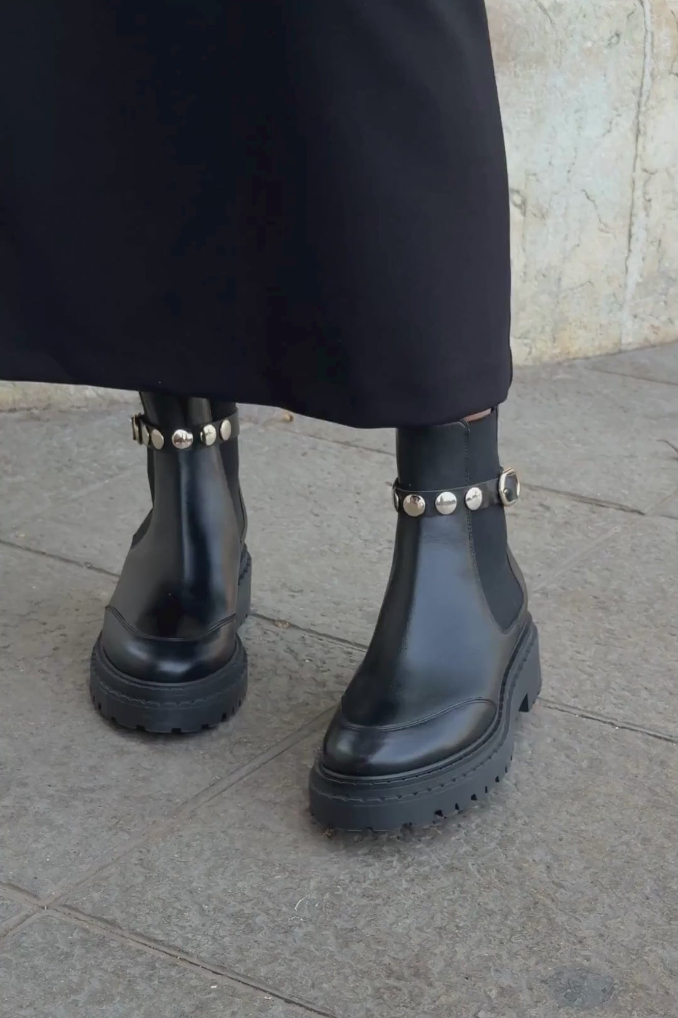 Chunky style boot with mid-top track sole in black leather that combines timeless and versatile style. Round toe with reinforced piece. Matching elastics on both sides that provide more looseness in the shaft and leather strap with golden studs that provide the Micuir essence. Upper leather strap for a more comfortable fit. Presents a 5.5 cm high rubber sole with microgel insole for greater comfort. Lining and insole made of goatskin leather and sole with ''handmade in Spain'' certificate with logo engraved on fire. Includes a cotton bag. Designed and handmade in Spain.