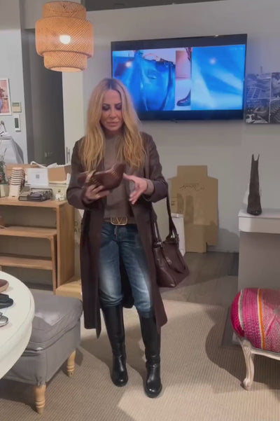 High-heeled black leather boot that combines timeless style with versatility. It features a round toe, a wide shaft with a top tab adorned with gold metal studs for easy on and off, and an inner zip. The boot has a 7 cm block heel and a microgel insole for added comfort. The lining and insole are made of a blend of goatskin leather in a matching color, and the sole is certified "handmade in Spain" with a branded logo. A cotton bag is included. Designed and handcrafted in Spain.