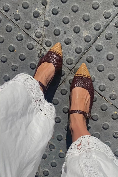 Bailarina de estilo merceditas en piel trenzada artesanalmente marrón chocolate, el equilibrio perfecto entre tendencia y atemporalidad. Puntera ligeramente fina en contraste de color tostado. Tira de cierre en empeine con cierre de hebilla regulable hipoalergenica. Presenta piso de 2 cm de altura con plantilla de microgel para un mayor confort. Forro y plantilla de piel mestizo de cabra a tono y planta con certificado ''handmade in Spain'' con logo grabado a fuego. Incluye una bolsa de algodón. Diseñado y fabricado artesanalmente en España.
