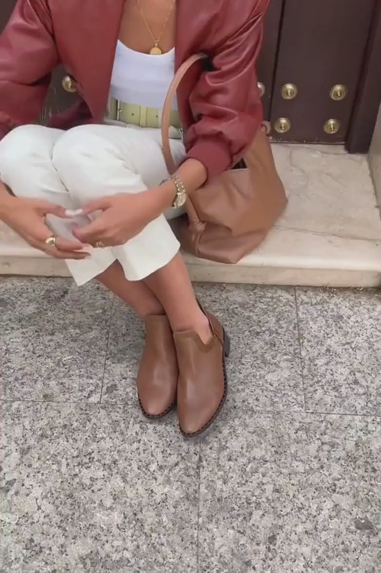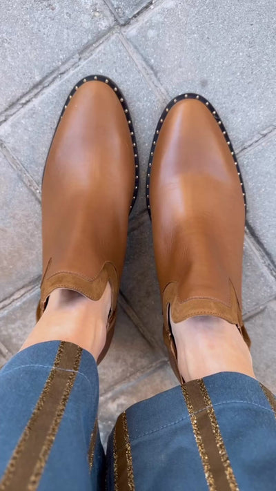Botín bajo en piel vacuna premium marrón caramelo con cantos pintados a mano, es el equilibrio perfecto entre atemporalidad y carácter. Silueta abierta en el tobillo rematada con ribete a tono en piel ante, ofrece un acabado versátil. Detalle de tachas en el cerco que marcan la esencia Micuir a cada paso. Presenta un tacón de 4 cm de altura con plantilla de micro gel para un mayor confort. Forro y plantilla de piel mestizo de cabra a tono y planta con certificado ''Handmade in Spain'' con logo grabado a fuego. Incluye una bolsa de algodón. Diseñado y fabricado artesanalmente en España.