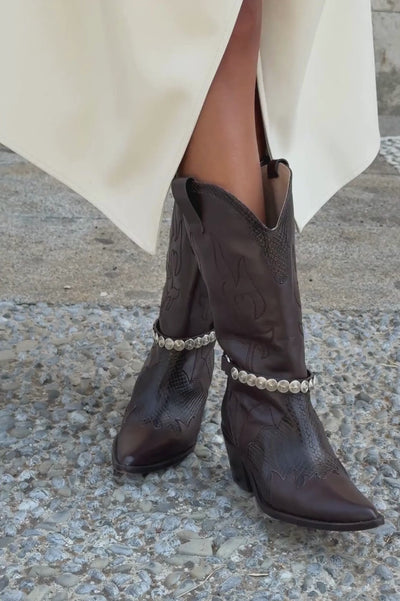 Bota de estilo cowboy botas de caña media en piel chocolate. Piezas en empeine, talón y parte superior en piel grabada snake a tono con bordados a tono en caña. Detalle de cadena con tachas únicas metálicas en plata. Presenta un tacón de 7 cm de altura con plantilla de micro gel para un mayor confort y tiras laterales de piel para mayor calce. Forro y plantilla de piel mestizo de cabra a tono y planta con certificado ''Handmade in Spain'' con logo grabado a fuego. Incluye una bolsa de algodón. Diseñado y fabricado artesanalmente en España.