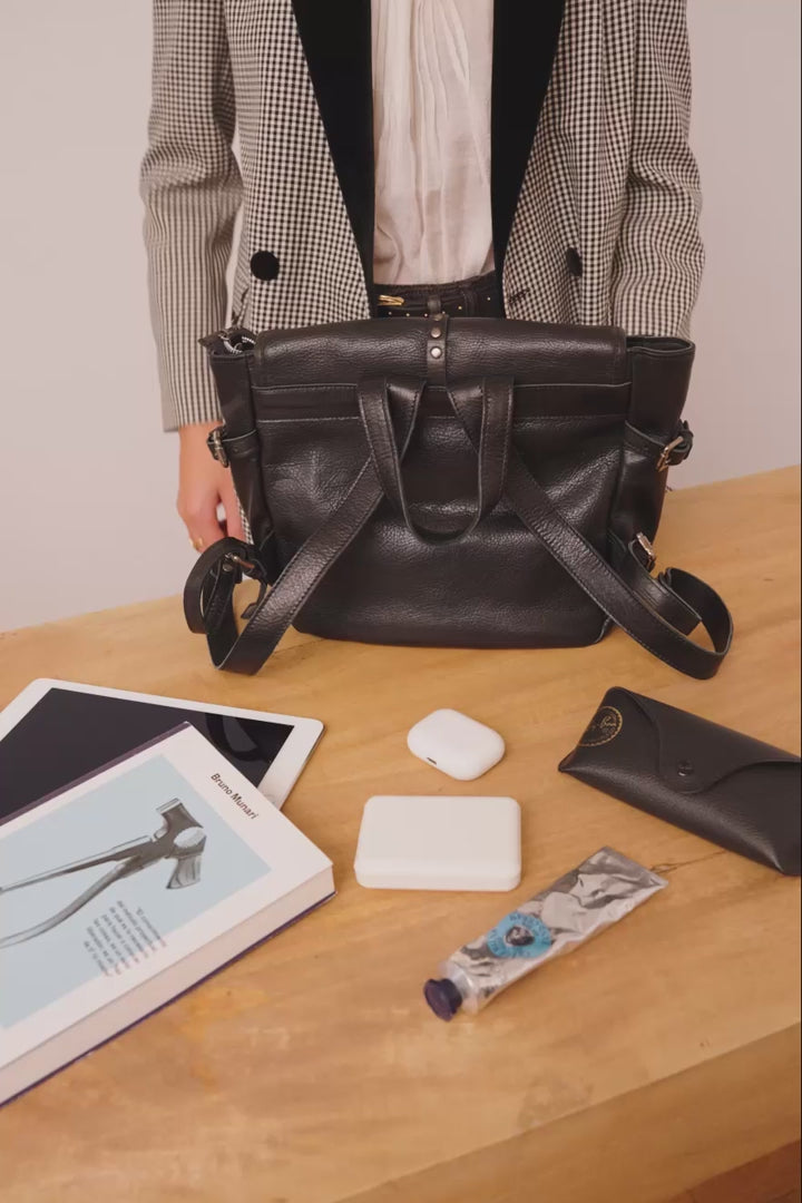 Nuestra icónica mochila en piel vacuna negra es el equilibrio perfecto entre atemporalidad y carácter. Diseño con líneas redondeadas y una solapa frontal amplia que se cierra mediante una tira decorativa en forma de lágrima con botón automático interior, adornada con tachuelas metálicas en tono oro envejecido lo que marca la esencia Micuir. Presenta asas a hombro regulables y asa corta de mano. Cierre con cremallera metálica en su interior, forro de algodón a tono con bolsillo con cremallera de cierre. Incluye una bolsa de algodón. Diseñado y fabricado artesanalmente en España.